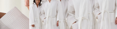 65% polyester/35% cotton waffle weave. Lightweight fabric. Kimono style robe. Two patch pockets. Tie front. Hanging loop.