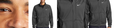 Made from at least 75% recycled polyester fabric, Nike has engineered a cover-up that looks and feels like your favorite sweater-but is ready to perform with Dri-FIT technology. Design details include a cadet collar, reverse coil zipper with faux leather zipper pull, rib knit cuffs and rib knit hem. A contrast Swoosh logo is embroidered on left sleeve and center back neck. Made of 8.3-ounce polyester Dri-FIT fabric.